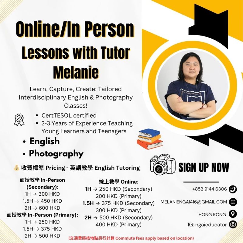 My core methodology involves weaving English together with subjects like Geography, History, Sciences, and Visual Storytelling through Photography. This means students don't just learn grammar in isolation; they develop the critical skill of applying fluent English to analyze historical events and photographs, write compelling scientific and analytical reports, and describe complex geographical and visual concepts. This approach is specifically designed for top performance in international curricula such as IGCSE, IB, and HKDSE. I believe learning should be fun and inspiring, and being fluent in English, Cantonese, and Mandarin, I am able to create a warm, supportive, and engaging environment for a diverse range of students.