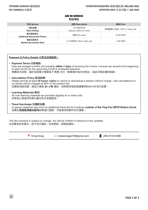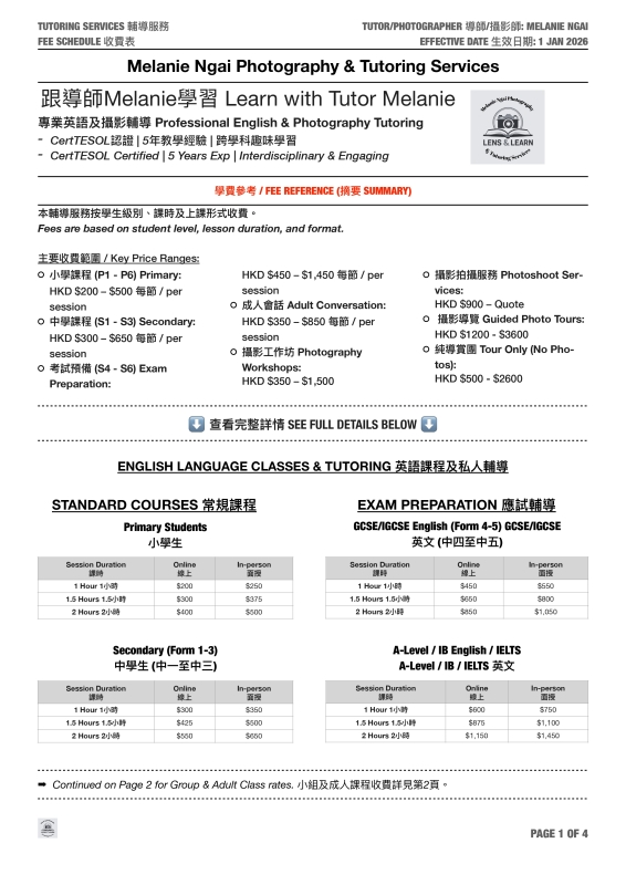 - 1-hour Session: HKD $300 (online) or HKD $350 (in person) : Ideal for focused skill-building (e.g., essay structure, grammar review).