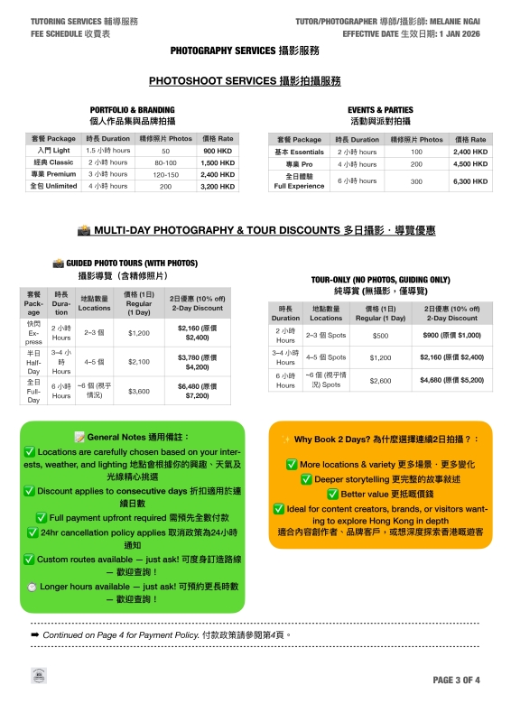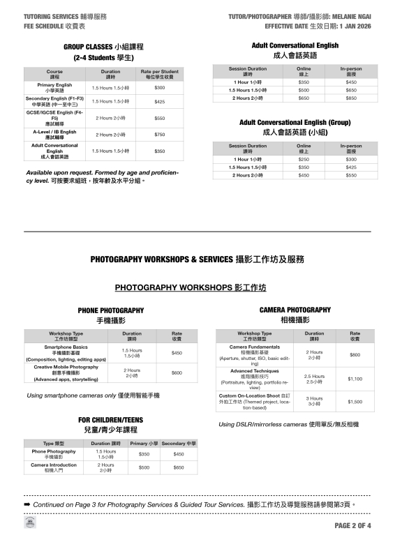 - 1.5-hour Session: HKD $425 (online) or HKD $500 (in person) Most Popular : Perfect for immersive, integrated lessons (e.g., writing a report or analyzing a historical text).